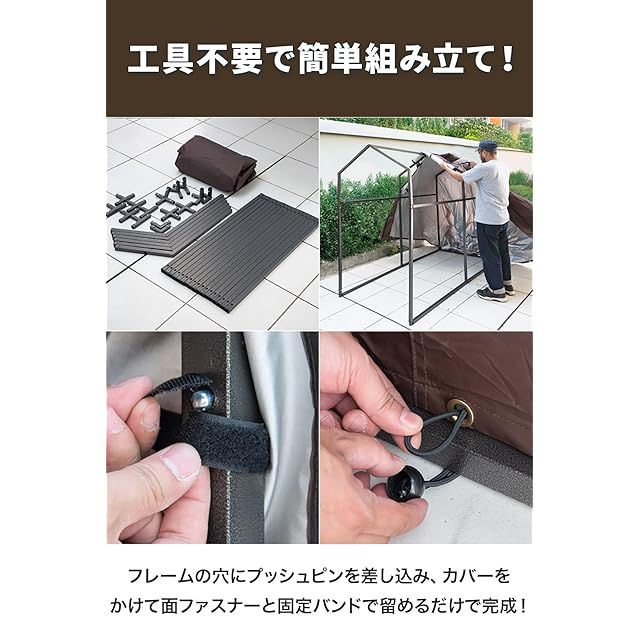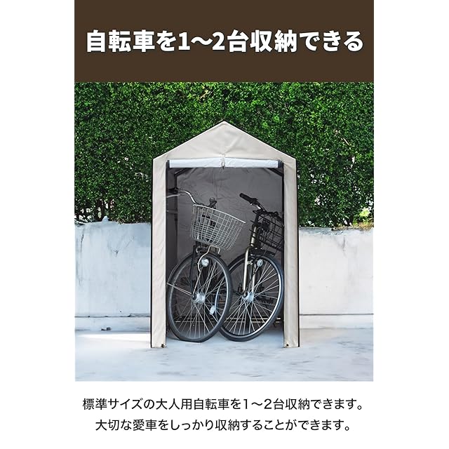 ✅【自転車やバイクをしっかり収納】幅100cm×奥行195cm、標準サイズの大人用自転車を1~2台収納できるサイズです。大切な愛車をしっかり収納することができます。✅【工具不要で簡単組み立て!】フレームの穴にプッシュピンを組み合わせて差し込み、カバーを被せて面ファスナーと固定バンドを留めるだけ、工具不要の簡単組み立てです。