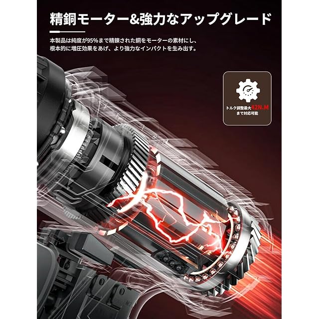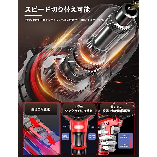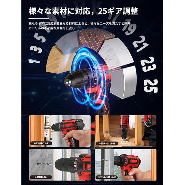 【42N·mの強力トルク&25段階調整】最大トルク42N·mと25段階のトルク調整機能を備え、回転速度は2段階(0~350RPM / 0~1650RPM)の切り替えが可能で、トリガーの押し込み具合による無段階微調整も対応しており、木材、金属、プラスチックなど多様な素材に合わせてトルクと速度を最適化し、素材を傷つけず効率的で正確な作業を実現します。