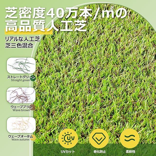 【リアル感ある人工芝】ストレートとウェーブ状の葉三つをミックスしている芝糸、天然芝のようなリアル感があり、ふかふかの踏み心地、適当的な柔らかさでお使い気持ちがよいです。