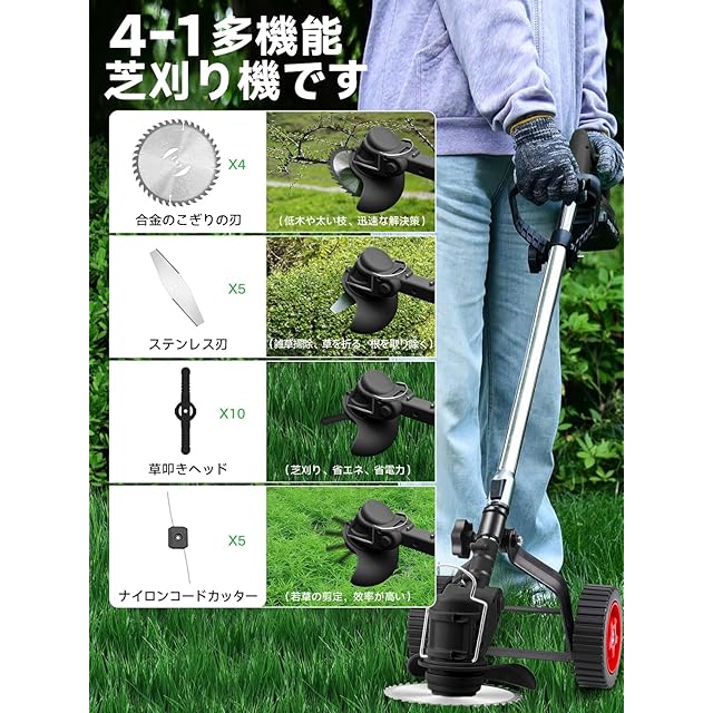 * ✅【4-in-1多機能草刈り機&でより多くのシーンのニーズに対応】この芝刈り機は合金の刃です、プラスチック刃、丸い鉄片です、ナイロン製のひもの4種類の刃から選択でき。柔らかな芝生から乾燥した芝地、茂みや岩の間、または建物の壁際の雑草まで、どんな場所でも軽々と対応できます。ナイロン製のひもは石が多い場所に適しており、プラスチック刃は柔らかい若草の刈り込みに適しています。合金の刃は硬い草、乾燥した草、および低木の刈り込みに使用され、丸い鉄片です太い低木や木の枝の刈り込みに適しています。4種類の切削ツールを状況に応じて柔軟に組み合わせ、あらゆる地形の課題を軽松解決。