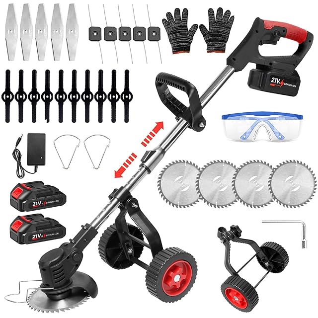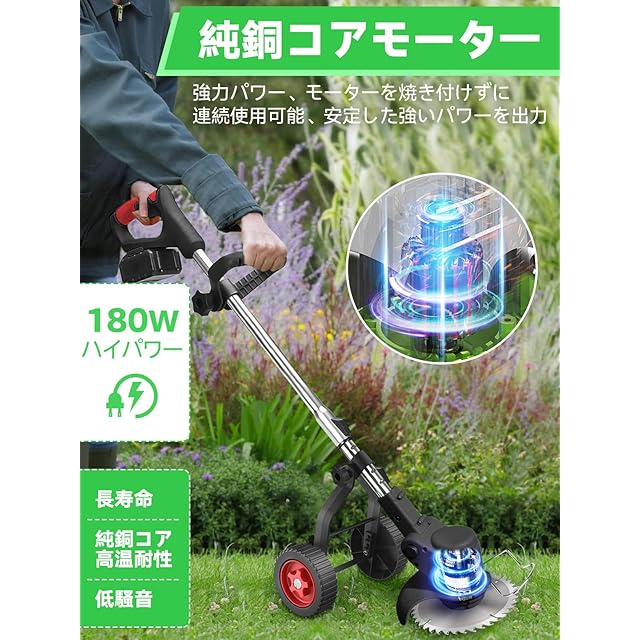 草刈り機 【2025最新型】芝刈り機 草刈り機 充電式 4種類の替刃 21V 18000rpm コードレス 伸縮式 大容量バッテリー2個 補助輪 3段階で角度調整可能 軽量 低騒音 安全 樹脂回転刃 枝切り 芝生庭 畑 雑草 草 植木 替え刃 家庭用電動芝刈り機・園芸用DIY 日本語説明書付(ブラック)