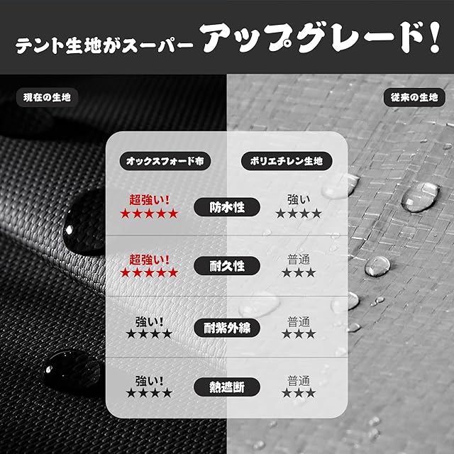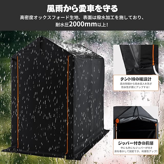 【日差しや風雨から愛車を守る】テント全体は高密度オックスフォード生地を採用!紫外線や熱を遮断し、大切な愛車の劣化や色あせを防ぎます。テント表面は撥水加工を施しており、2000mm以上の耐水圧で雨水侵入を完全に防ぎます。テントの縁も裾のデザインを採用して防水性が更にアップする!前扉のファスナーを閉めて大切な収納物をしっかり守ります。
