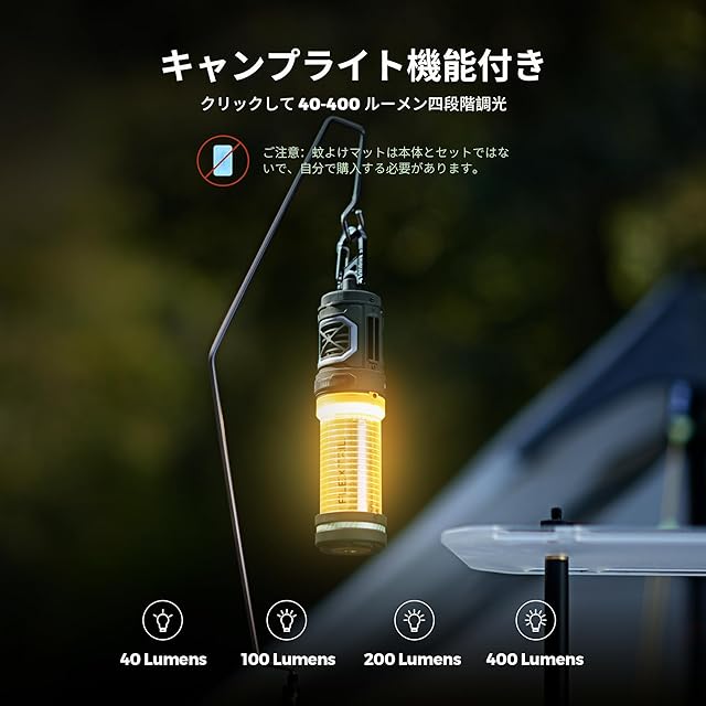 【キャンプライト】キャンプの時、TINY REPELLERをライトとして使用することができます。また、4段階の明るさ調節機能を搭載しており、シーンに合わせて適切な明るさを選択できます。