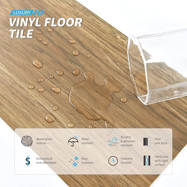 リアルな木目質感 :フロアタイルの表面はエンボス加工されており、本物の木目に見間違うほどのリアルな質感を再現しています。さらりとした手触りで、表面には耐摩耗加工が施されているため、キズがつきにくい設計です。また、防水・防火 効果もあり、土足でも素足でも快適にご使用いただけます