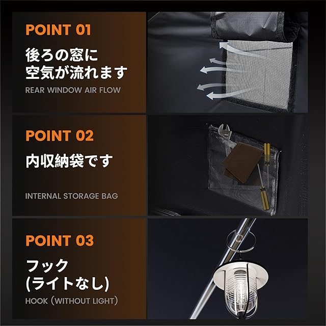 [多機能]:サイクルハウスとしてガレージの役割はもちろん他にも便利な設計が施されています。カバーの内部には、サイトポケットが含まれており、バイクのメンテナンス工具やタオルを収納することできます。上部の鋼管には脱着式フックで作業灯を吊り下げ可能なため、車庫内でメンテナンスや清掃作業が快適に行えます。サイクルハウスの背面にメッシュ窓を配置し、通気性が向上します。