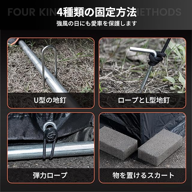 [全金属フレーム・防風]:Anovaraサイクルハウスのフレームはすべて直径24mm、壁厚0.9mmの亜鉛メッキ鋼管を採用、プラスチック部品は一切使用せず。4種類の固定方法を組み合わせた堅牢構造です。U型ペグで底部の鋼管を包み込んで地中に打設し、ロープとL型ペグを組み合わせてテントのように固定、弾力ロープが布カバーとフレームを緊密に固定、裾部に延長されたスカートに重石などの重物を置くことで固定され、強風時でも愛車を保護します。