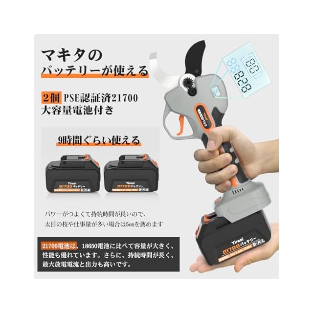 【PSE認証取得&マキタと互換】この充電式剪定は人間工学に基づき軽くて持ちやすいタイプです、女性や高齢者にも優しい軽量化を実現しており、ソフトグリップが握りやすいため、長時間使用しても腕に負担をかけることなく、時間と体力を節約できます。大容量バッテリーは6000mAh(3000mAh*2個)大容量なので連続的に9時間以上剪定できます。バッテリーは既にPSE認証取得済なのであんぜんにご使用できますし、マキタ18Vバッテリーと互換できるし、非常に便利です。
