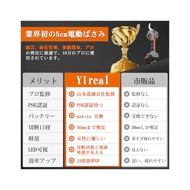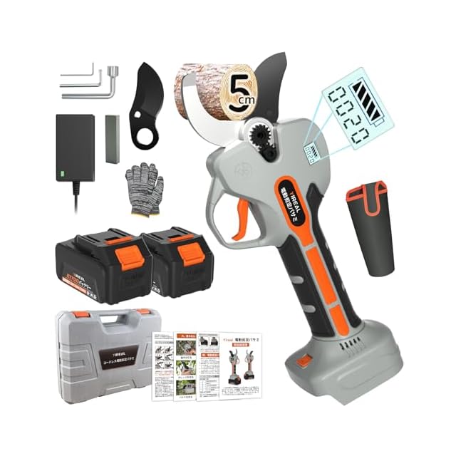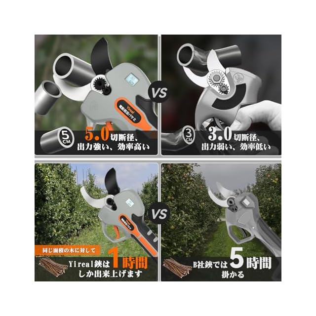 【50mm切断径&山本造園会社監修】Yirealの充電式剪定鋏は業界初の5cm電動剪定鋏、さいだい切断径50mmの枝を楽々に切れます。開き口は半開・全開の2段階に調節できる、半開なら小さな開口は作業時間と電力を節約し、全開なら太い枝を簡単に切れます。弊店の電動バサミは山本造園会社監修で植木屋さんが楽に剪定作業するために開発しました。この10年に世界中2万の造園会社に10万以上の植木屋さんが利用しています。