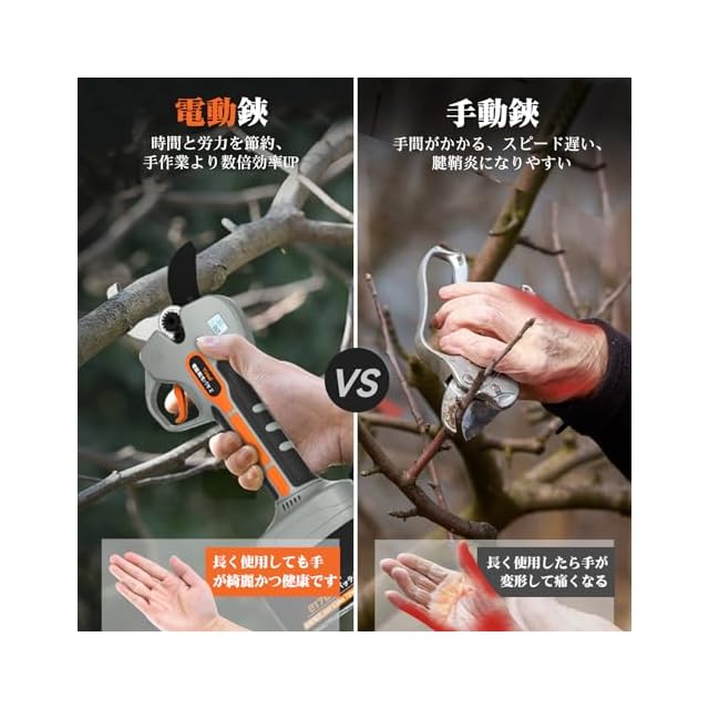 【幅広い用途&アフタサービス】充電式剪定ばさみは、庭木の剪定、造園作業、伐採や刈り枝の処理には抜群の作業能力で欠かせなくなります。腕、肩への負荷が小さく、園芸作業を楽にします。ご家族やお友達やご大切な方へのギフトとしては最高です。本体は1年保しょうあり、日本語取扱説明書もあります。ご購入後、何かご不明な点がございましたら、お気軽にお問い合わせください。