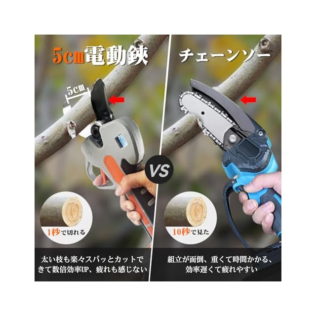 【SK5ブレード&切れ味抜群】鋏の刃は日本製のSK5高炭素テフロン鋼から作られて高硬度で切れ味抜群です。ブラシレスモーター搭載してパワーが強くて、50mmまでの生木を1秒に瞬時に切断でき、切れ味が良くて切断面が平にキレイ、植木の健康を守れます。