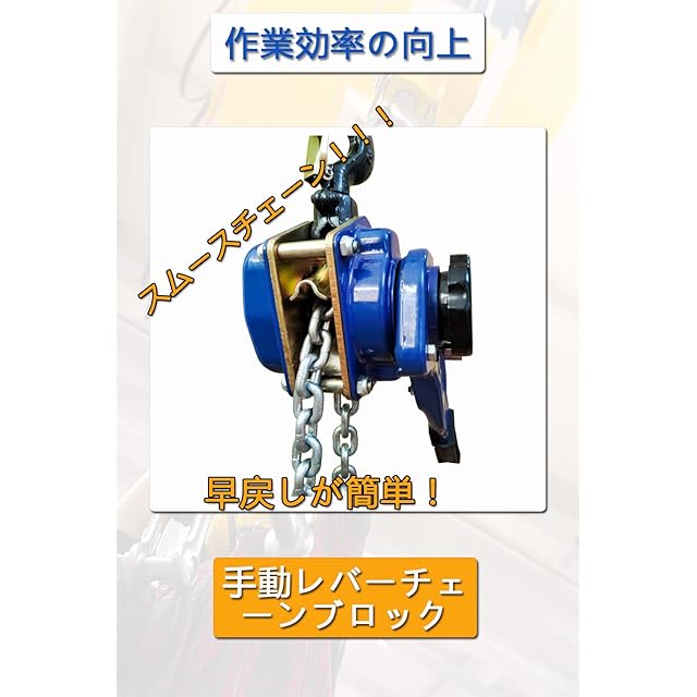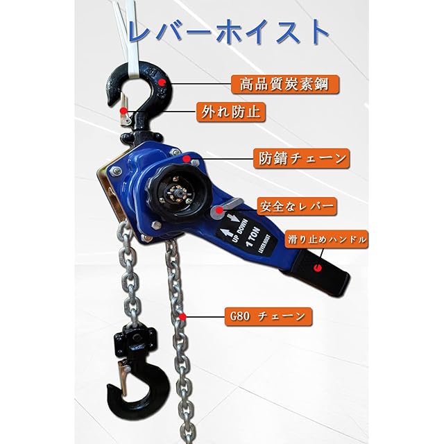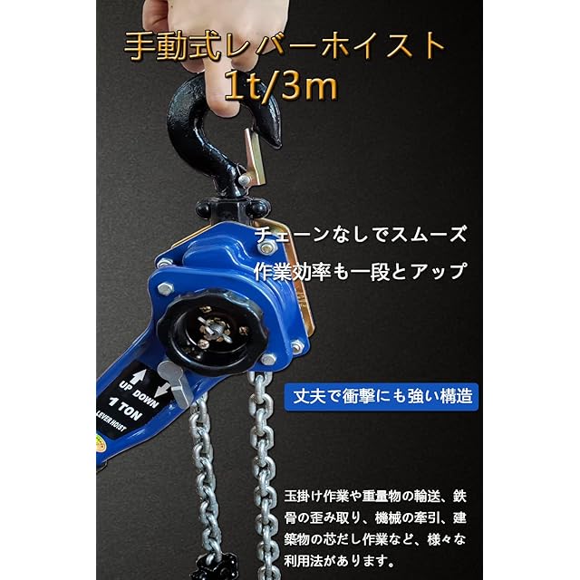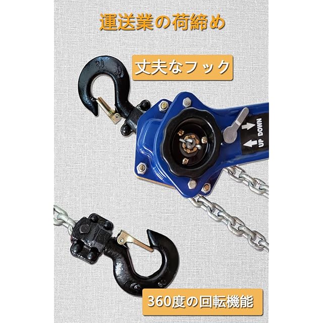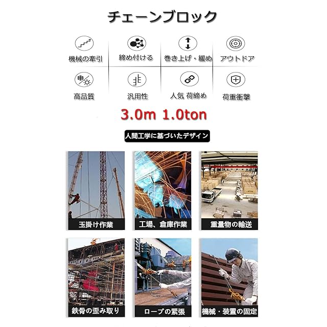 【耐荷重1000kg】チェーンはステンレス製の上に防さび加工を加え、錆びにくく耐久性があり、ワンタッチ遊転を採用し操作性をアップしました。定格荷重は1トン、標準揚程3mがある、チェーンは個人用としても業務用としても十分です。