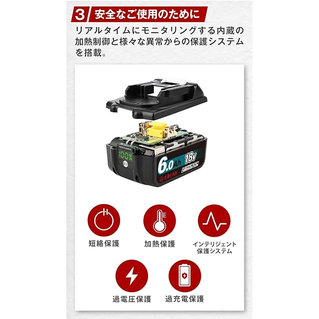 【保護システム搭載】リアルタイムにモニタリングする内蔵の過熱制御と様々な異常からの保護システムを搭載。短絡保護、加熱保護、インテリジェント保護システム、過電圧保護、過充電保護に対応。