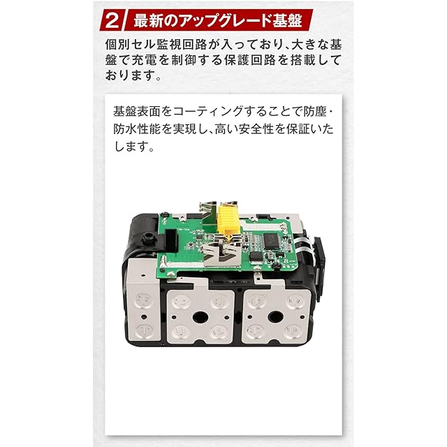 【アップグレード基盤を採用】個別セル監視回路が入っており、大きな基盤で充電を制御する保護回路を搭載しております。基板表面をコーティングすることで防塵・防水性能を実現し、高い安全性を保証いたします。