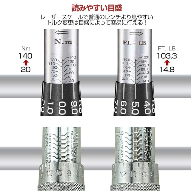 トルクレンチ プレセット型 車/バイク修理レンチ タイヤ交換 差込角9.5mm(3/8インチ) 20-140N・m 12/13/14/17mm 1/4変換ソケット 1/2変換ソケット付き ソケットレンチ ケース付き