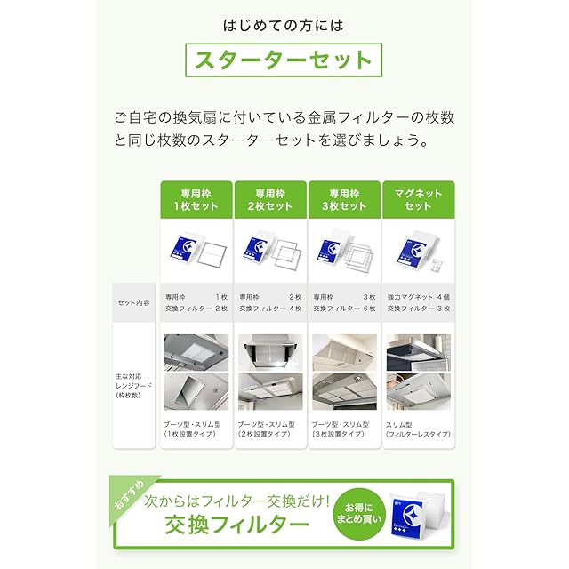 ●297×290mm枠用:タカラスタンダード VU-603/901/902/903、 VUS-603/604/605/903/904/905●297×340mm枠用:F341、F347、A341H1AA、BDRシリーズ、BDRLシリーズ●297×350mm枠用:VNS-902/903/904/905、SVNS-902/903/904/905、VMH-601/901、VMR-905/906●297×400mm枠用:F401、SBAR-901/902、SBARF-901/902、SBARL-901/902●372×350mm枠用:VMH-752/753、VMR-754/755/756●マグネットタイプ:フィルターレスタイプ、ノンフィルター、よごれんフード、ほっとくリーンフード、とってもクリンフード、キレイツモフード、イージーフィルタ