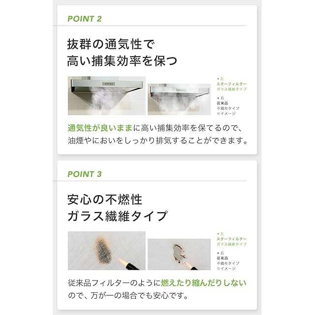 【不燃性のガラス繊維タイプ】 不燃性のガラス繊維なので万が一の場合でも安心です。従来品のフィルターのように燃えたり縮んで落下しません。