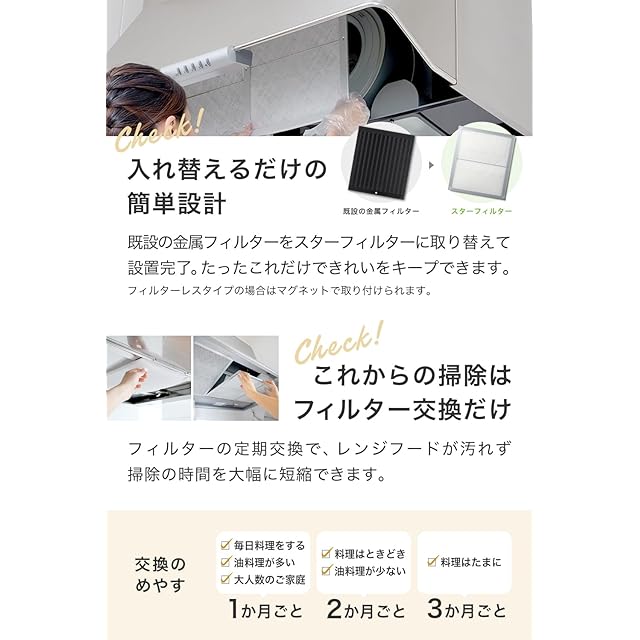 【入れ替えるだけの簡単お手入れ】多くのご家庭のレンジフードに備え付けられている金属フィルターをスターフィルターに取り替えて設置は完了です。これだけで換気扇のきれいが長持ちし、お手入れが劇的にラクに。フィルターレスタイプの場合はマグネットで取り付けられます。