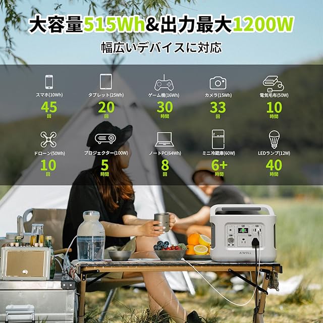 【最大9台のデバイスを同時充電】AIWOLLポータブル電源は160938mAh/515Whの大容量、余裕たっぷりの出力ポートで様々な機器や端末に充電できます。USB端子はPDを含め合計4個搭載しており、AC出力は2口搭載しています。USB、DC、ACなど、合わせて最大9個の機器に同時給電が可能です。60Hzまたは50/60Hzの両方対応の製品に使用することができます。50Hzにしか対応していない製品は動作しませんのでご注意ください。(注意:AC不使用時、スイッチを切てください、もっと節電できます)