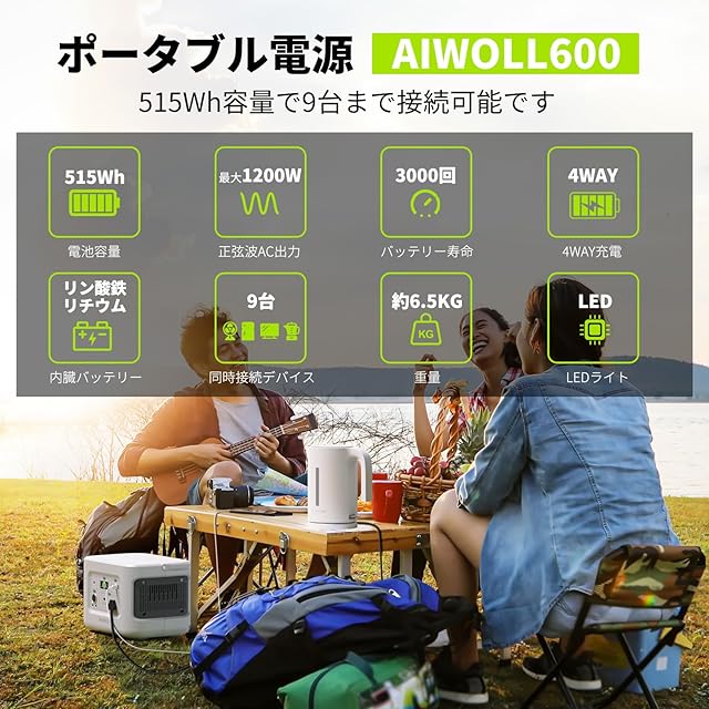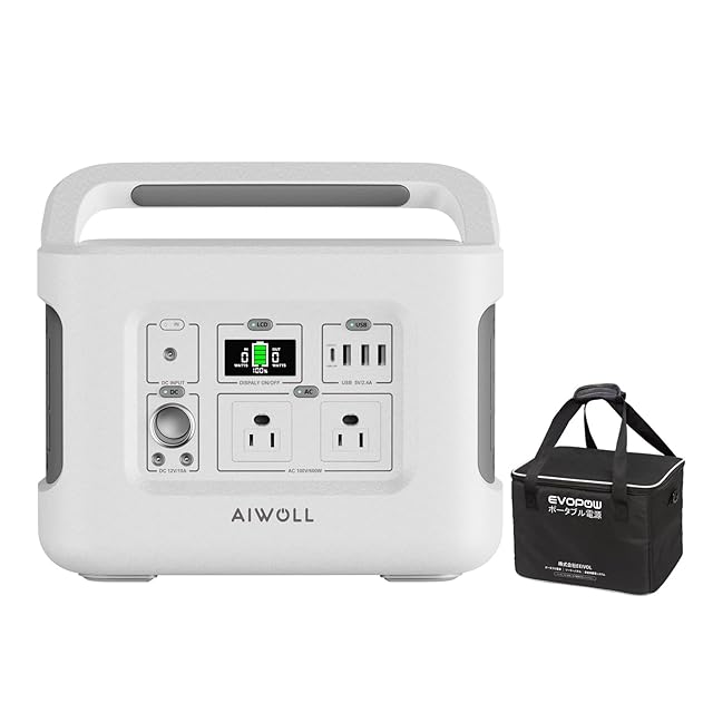 ポータブル電源 リン酸鉄リチウム 515Wh/160938mAh AC出力600W (瞬間最大1200W) 純正弦波 AIWOLL 大容量ポータブルバッテリー 充放電サイクル3,000回以上 高耐久 BMS電池保護機能 パススルー機能付き 高速充電 PSE認証済 LEDライト付き MPPT制御方式 ソーラー充電 収納バッグ付属