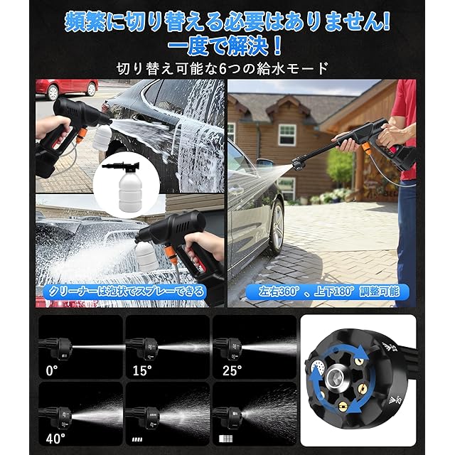 【多機能6-in-1ノズル、泡ポット】洗車机は一体型の6合1マルチモードノズルを装備しており、ノズルを回転させることで角度を調節できます。0°、15°、25°、40°、拡散スプレーモード、シャワーモードの6種類の噴射モードを簡単に切り替えられ、頻繁にノズルを交換する手間がありません。6種類の異なった噴射モード、例えば:車の載具、園芸/緑の保護、農作物の灌漑の広い範囲、汚れた高い壁、水槽などの掃除しにくい場所、それは水の流れと水圧を調節することができて、水圧は強くて、安定して、いくつかのモードを持っています:使用者は簡単な操作を通じて異なった清潔モードを切り替えることができて、多種の圧力噴射モード、頻繁にノズルを交換する必要がありません; 高圧洗浄機には洗車用に設計された泡ボトルも付属しており、濃密できめ細かい泡が瞬時に刺激されてボディワークを均一に覆い、窓やドアの汚れを目立たなくし、洗車体験をアップグレードしてプロ級の洗浄結果を楽しむことができます。 家庭での洗浄に最適で、1台持っていると便利です。