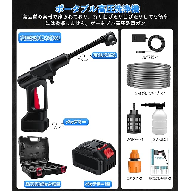 【部品がそろっている、品質保証】洗浄机の高エネルギーの圧力、高圧の直噴、強力な沖力、スムーズで安定した出力です;工具収納ボックスx1、高圧洗浄機本体x1、21Vバッテリーボックスx 1、充電器x1、6 in1ノズルx1、泡ポットx1、5m 給水パイプ x 1、大型六角フィルターx1、日本語取扱説明書x1を含みます。購入日から6ヶ月間の保証を提供します。VOTUDX高圧洗浄機関するや質問がある場合は、お気軽にお問い合わせください。24時間オンラインで、最短時間で問題を解決できます。ご安心になって利用ください。