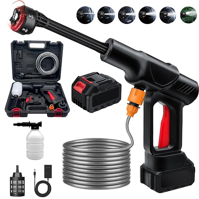 【20000mAhバッテリ✨】本製品は20000mAhの大容量バッテリーを搭載し、コードレス充電式洗車機として、その軽量設計との大容量バッテリーを搭載した約800gの裸金属は、追加のバッテリー購入費用を節約できます。 自宅でも屋外でも、いつでも持ち運びができ、配線の手間が省け、安全性が大幅に向上します。バルコニーや浴室など狭い範囲の掃除に最適です(5mホース付き)、電源コードが届かない場所でも使用でき、現場の使い勝手を大幅に強化し、いつでも簡単に掃除が完了し、ワイヤレスの自由を満喫できます。ご注意:使用前にバッテリーをフル充電してください。最適な効果を得るために、充電を完了させてから使用してください。