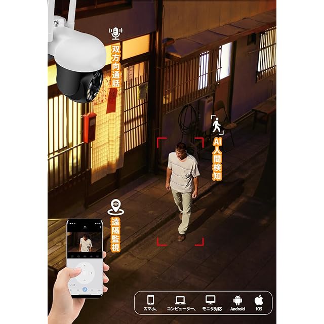 【動体検知・防水防塵・双方向音声・リアルタイム映像】動体検知機能を搭載し録画内容の最適化を実現し、監視録画中の人物を素早く検索して関連ビデオを見ることができます。高性能なIP66の防水防塵機能ですので、雨や雪の厳しい環境でも安心してご使用いただけます。最新のP2P技術を採用し、カメラにマイクとスピーカーを内蔵。携帯端末との会話も可能です。さらに製品構造に対して数百回のアルゴリズムの調整を行った事により集音問題を解決できました。いつでもクリアな音声を聞けることができます。