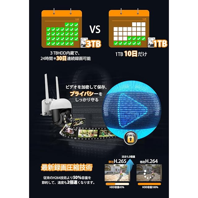 【3TB大容量HDD&H265+24時間90日の録画可能】ワイヤレス監視セット NVRに上品質な3TBHDDが搭載し、最新圧縮方式H.265対応、ストレージ容量を節約しますから、H.264より 2 倍以上のハードディスク容量を節約しますし、3TBハードディスクを内蔵し24時間90日以上の録画が可能です。録画データが満了になると自動的に古いデータから上書きします。また、HDDの残量がなくなる場合、システムは自動的に最も古い録画データを上書きして最新に生成されたデータを保存し、手動による削除は不要!1年365日にループ録画できます。