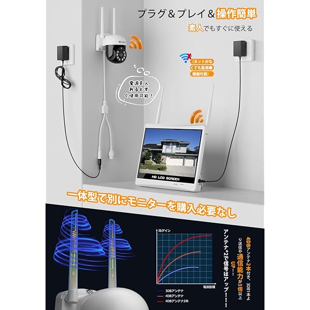 【双アンテナで信号UP!&簡単接続●工事不要】防犯カメラは最新強化版WiFiアンテナ*2を採用して、従来の単アンテナより、信号は何倍増強します。従って、距離が遠くても、信号を安定に接続し、頻繁に連絡が中断することを避けます。電源を入れるだけで録画が開始、初期設定不要。出荷前に稼働試験実施しており、初期のセットアップが完了しております。届いてすぐに映像確認、録画開始。ネット環境なくても録画機でライブ視聴、再生、設定できます。遠隔監視するときにネット環境が必要です。初心者にも優しい防犯カメラセットです。小型なので住宅、玄関、駐車場、農園、果樹園、ゴミ捨て場の不法投棄監視に最適です。