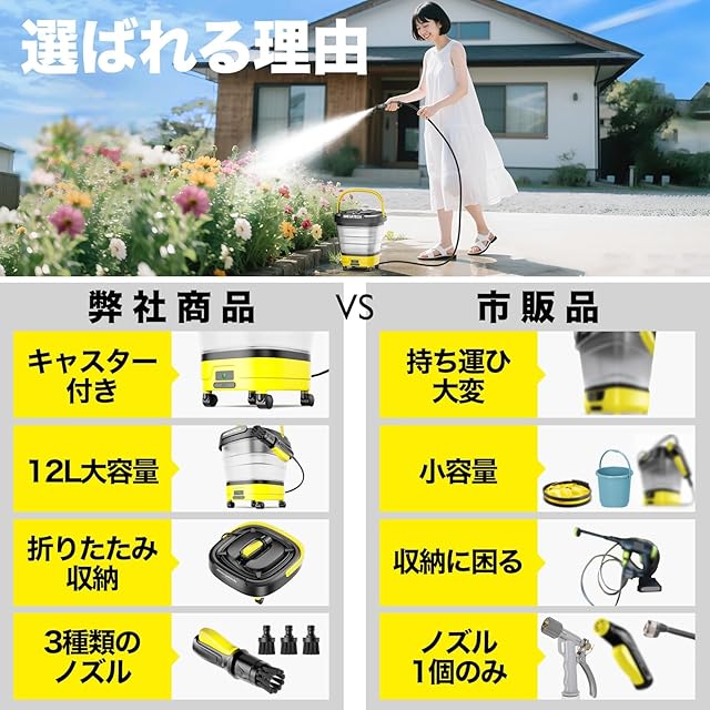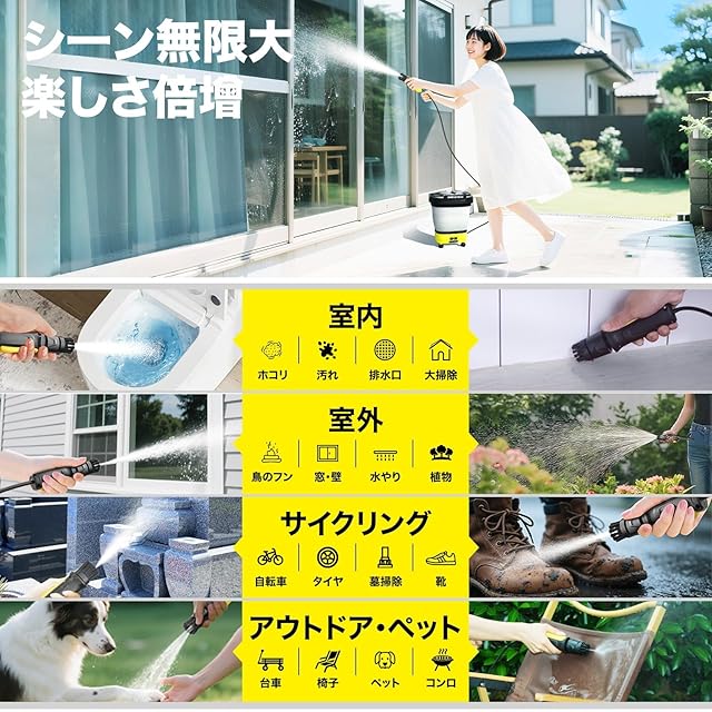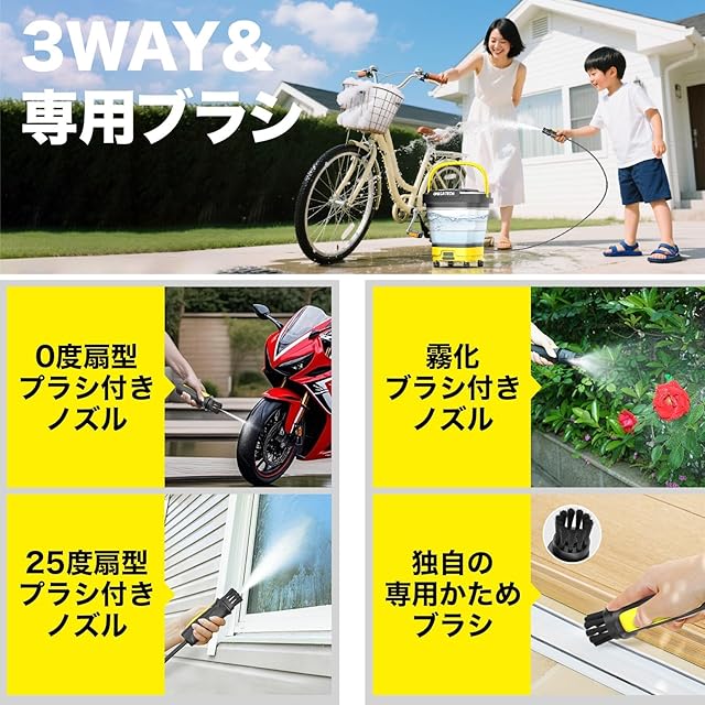【高圧・広角・霧化3種ブラシノズル+独自の専用かためブラシ+洗車グローブ付き】 付属ノズルは0°高圧ノズル・25°広角ノズルの2種に加え、霧化ブラシ付きノズル+独自の専用かためブラシ、さらに期間限定のプレゼント洗車グローブ付き。水だけでは取りきれない泥や苔も、ブラシと併用で徹底洗浄。ベランダ、窓、浴室、ガレージから軽洗車、墓石掃除、海での砂落とし、窓の清掃はもちろん、床、庭、花や野菜の水やり、園芸用具、ガレージ、キャンプ、バーベキューなどのアウトドアシーンにも対応可能です。幅広く使えるオールインワン設計!【ご注意】一部の商品にわずかな水が出てくる場合がございますが、これはすべての製品がメーカー出荷前に品質確認のため、水を用いたテストを行っているためです。中古品ではなく新品ですので、ご安心ください。本製品には1年間の品質保証が付いております。