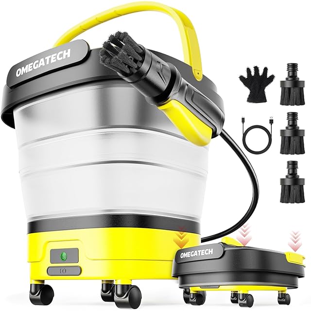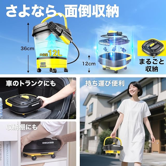 高圧洗浄機 キャスター付 コードレス 折り畳み式 Foldable 国内洗浄店監修 Omegatech マルチクリーナー 充電式 コードレス 家庭用 タンク一体型洗浄機 コンパクト12Lバケツ 収納高12cm 35分連続使用 Type-C充電 水道不要 4倍水道圧力 軽量 持ち運び便利 簡易シャワー ベランダ/墓石掃除/自転車/玄関 PSE認証 高圧/広角/霧化3種ノズル 洗車グローブ付 日本企業