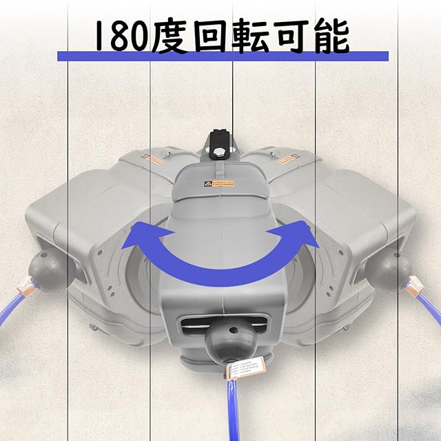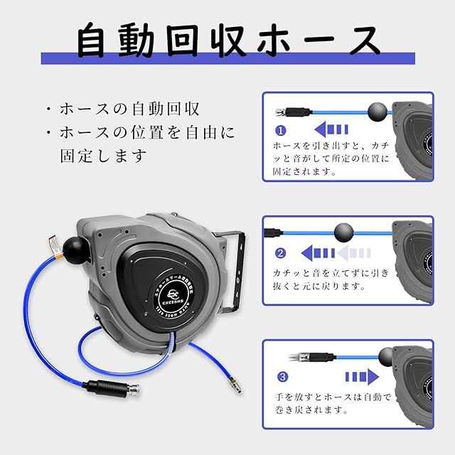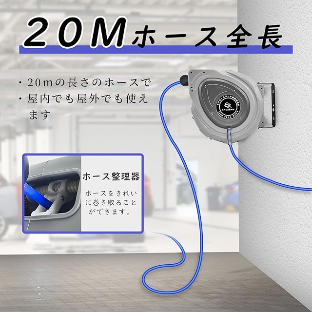 【20mのロングサイズ】ホースの全長は20メートルで、コンパクトなデザインで旅行時に持ち運びやすく、自動車修理店などの場所での使用に適しています。絡まり防止機能があり、高速で巻き取っても絡まりません。自動ロック機能により作業効率が向上します。ホースリールの長さは20メートルで屋外作業にも適しており大変便利です。