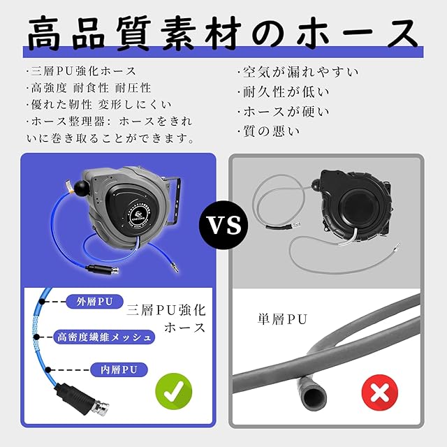 【耐久性】エアーホースリールには、アップグレードされたPUメッシュ管が使用されており、優れた柔軟性と強度を備えています。変形しにくく、漏れません、耐食性があります。頑丈な高強度ベアリングを採用し、長い寿命を持っています。