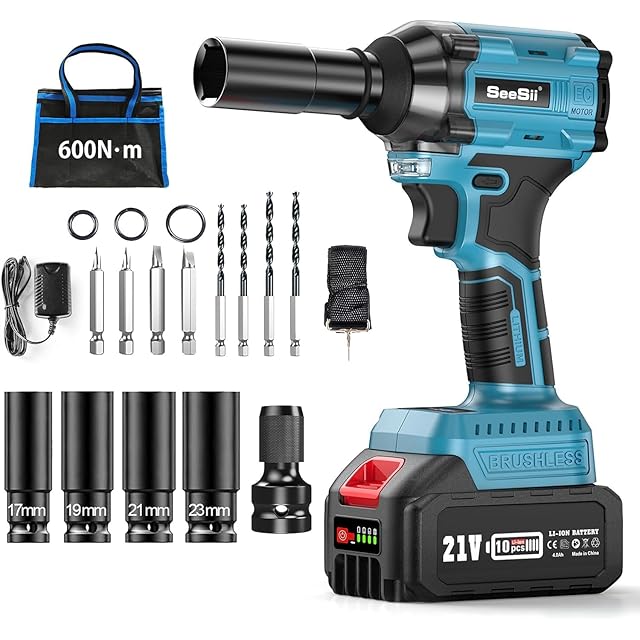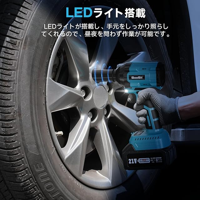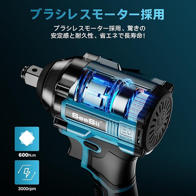 SEESII 電動インパクトレンチ 強力 600N・m ブラシレスモーター 1/2‘’トルクレンチ コンパクト&軽量 一台3役 電動レンチ ドリルドライバー インパクトドライバー 充電式 コードレス4.0Ahバッテリー一個付き 無段変速 ナットの締め付け ボルトの緩み タイヤ交換 ホイール交換 自動停止モード 正逆切替 LEDライト付き 豊かな付属品付き 型番 S6