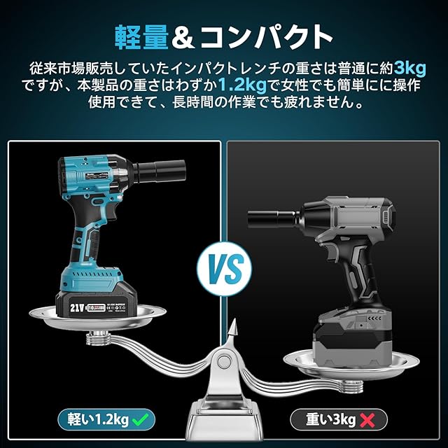 ❤【 最新進化版の小型インパクトレンチ】こちらは小型でコンパクトなコードレス充電式の多機能インパクトレンチです。完全充電後は、場所を選ばずどこでも持ち運びが可能で、作業が便利に行えます。従来市販されていたインパクトレンチの重量は通常約 3kg ですが、当製品はわずか 1.2kg で、女性の方でも簡単に操作・使用でき、長時間作業でも疲れにくいです。