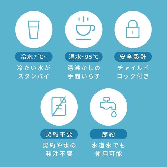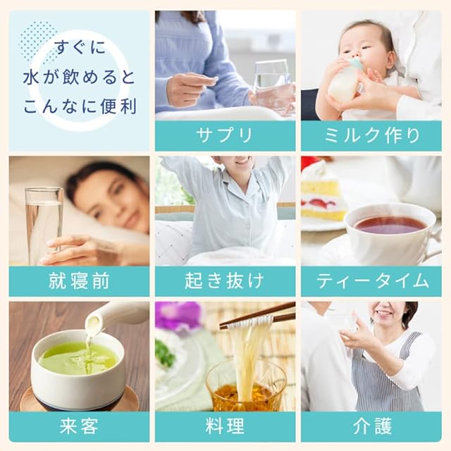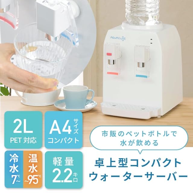 【コンパクトウォーターサーバーがある生活】A4サイズのコンパクトで軽量な卓上型コンパクトウォーターサーバーは水の契約が不要で、ペットボトルをセットするだけで簡単に使えます。市販のペットボトルに対応しており、水分補給はもちろん、薬の服用やミルク作り、ホット飲料やコーヒー、インスタント食品の作成などにも最適です。冷水は7℃から、温水は95℃までで就寝前や起き抜けの水分補給、ティータイムや来客時のおもてなし、料理の際の調理水など、幅広く使えます。さらに、介護の現場でも活躍するアイテムです。水道水も使用可能で、チャイルドロック付きで安心してお使いいただけます。重い水タンクではないので移動も楽にでき、いつでもどこでもお水を飲めます。