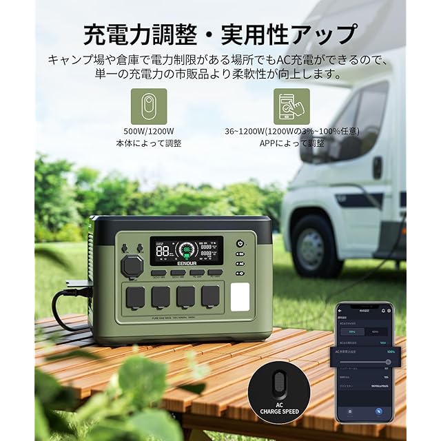 ✅【AC充電力調整・実用性アップ】柔軟性あるAC入力電力を設計することもポイントです。本体の調整スイッチを使うと、AC入力ワット数が500Wと1200Wとの二つモードを切り替えることができます、アプリを使うと1200Wの3%~100%(36W~1200W)を任意で調整できます。急な使用の時に、高入力で急速充電できるだけでなく、電池性能を保護し長持ちさせたい時やピーク時間帯でブレーカーを落とさないようにする場合は、低速充電するにも対応します。そして、キャンプ場などの電力制限がある場所でもAC充電ができるので、単一の充電電力の市販品より柔軟性が向上します。