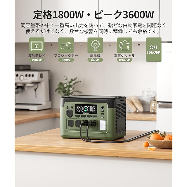 ✅【定格1800W・ピーク3600W】同容量帯の市販品と比べると、重量が12.9kgと13.3%軽量化して、コンパクトながら1800Wのインバーター出力量を持って一番高い出力も誇っています。家庭用蓄電池としてパワフル仕様のため、殆どな白物家電、電動工具、調理器具など問題なく使えるだけでなく、軽量とハンドルが付いて持ち運びに便利なので、車中泊、キャンプなどのアウトドアシーンでも大活躍します。