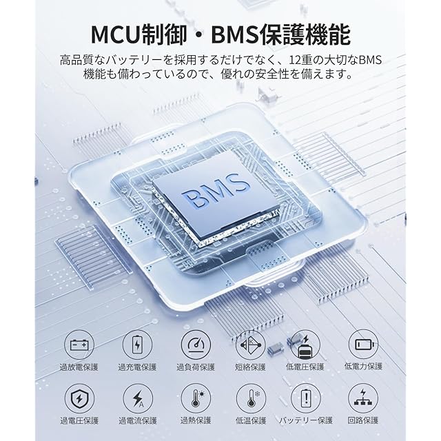 ✅【LiFePO4電池・安全性に優れる】内蔵電池はEV車用リン酸鉄リチウムバッテリー(LiFePO4)を採用することで、従来型のバッテリーより寿命が7倍長持ち、サイクル回数が6,500回になっても蓄電容量は残存50%と1日充電したり1日放電したりすると推定しても15年以上使うことが問題ないです。また、製品は制御装置(MCU)を装備しながら、バッテリー管理システム(BMS)も搭載して、過電流保護、過電圧保護、低電圧保護、過負荷保護、低温保護、高温保護、過充電保護、過放電保護、短絡保護、バッテリーバランス保護、通信障害保護、残量表示校正保護の12重の重要なBMS機能を備わって、安全性と耐久性を兼ね備えます。