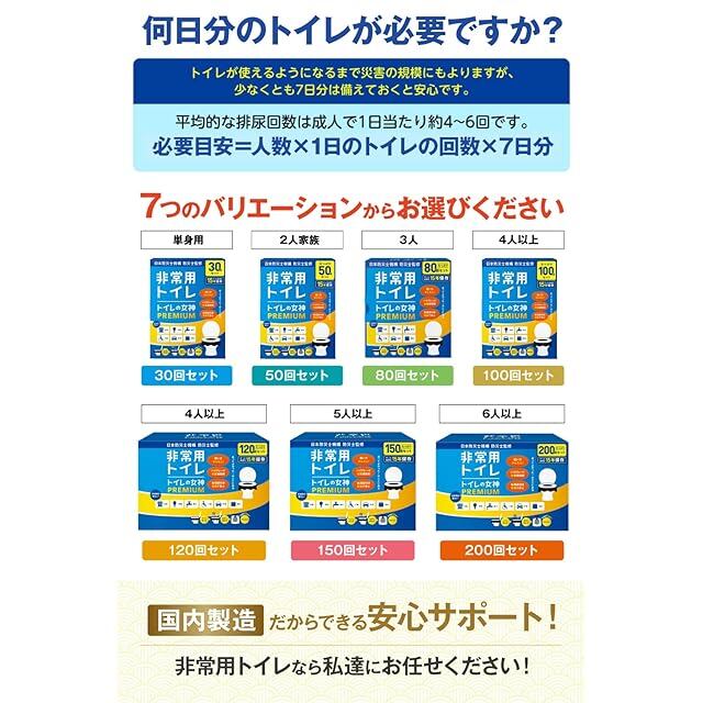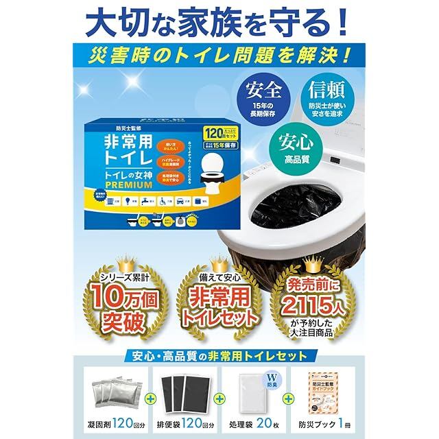 どこでも簡単トイレ トイレの女神PREMIUM 簡易トイレ 【2人~4人世帯向けに防災士が監修】 120回分 15年保存&日本製凝固剤 携帯トイレ 防災トイレ 非常用トイレ 防災グッズ 防災ガイドブック付き