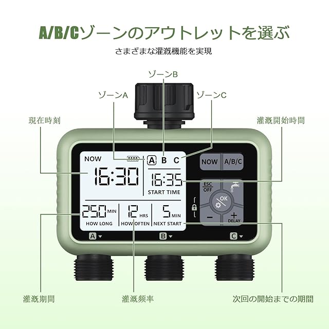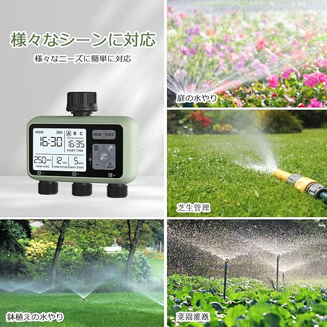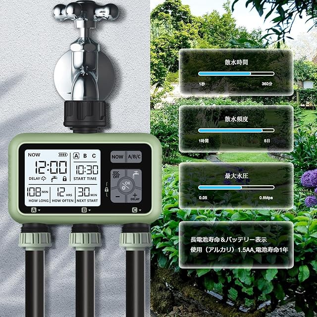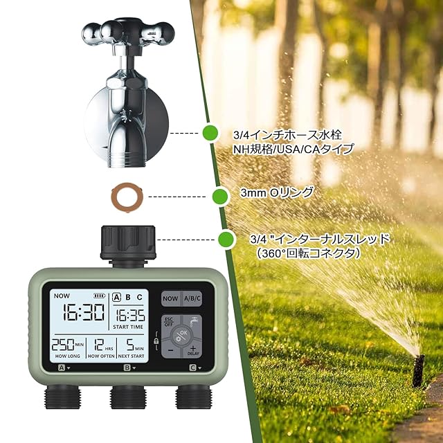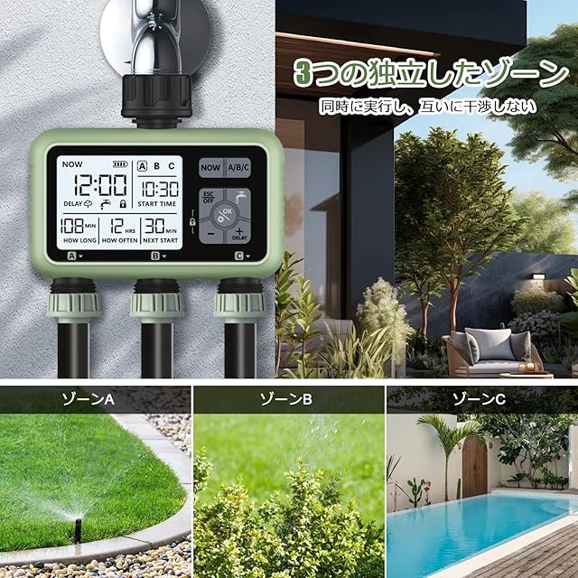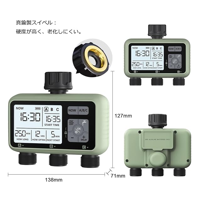「3つの独立した散水エリア&真鍮材料インターフェイス」:この新しくアップグレードされた灌漑システムは、3つの独立したバルブが装備されている、あなたはより柔軟にあなたの散水計画を設定し、完全に1台のマシンのデュアル-目的機能を実現することができます。新しくアップグレードされた黄色い銅の材料インタフェース、より強い、より強い耐腐食性。