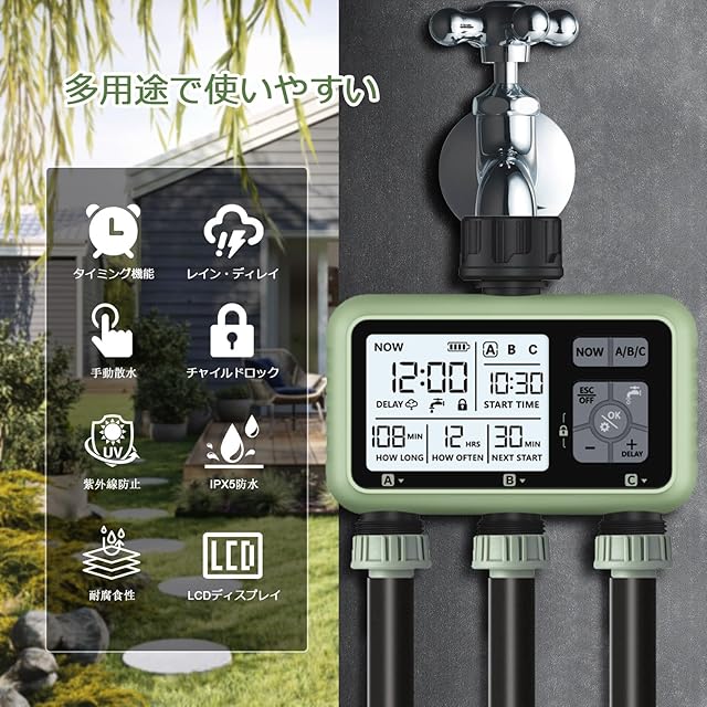 2024年新型 自動散水タイマー 散水ホース 3アウトレット 適格請求書ok 植物灌水 散水システム 散水用具 灌漑システム 給水 観葉植物 室内 鉢植え給水 鉢植え 自動灌漑/子供ロック/大雨遅延/手動灌漑 (グリーン)