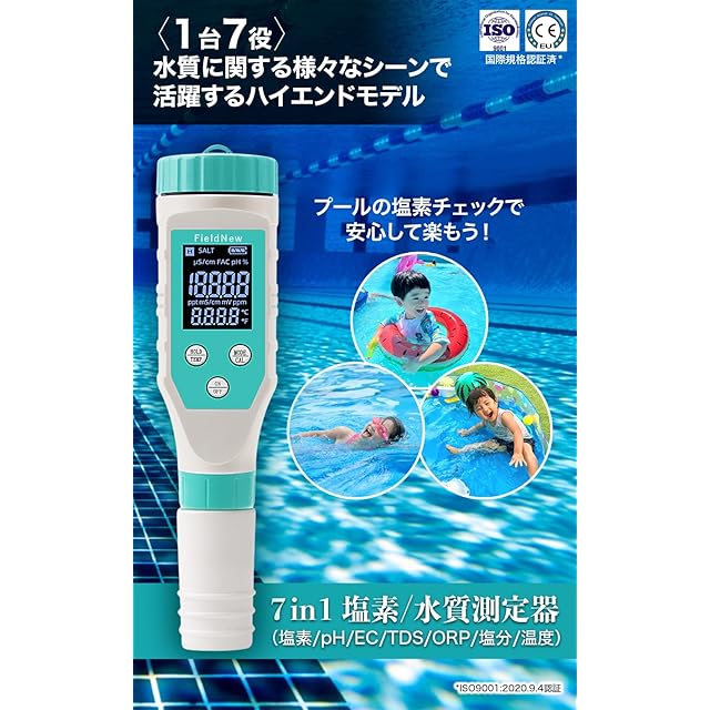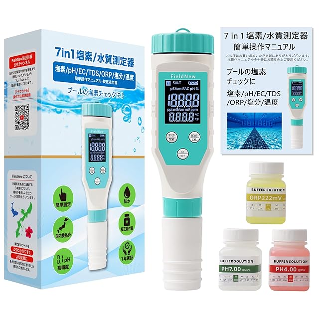 FieldNew 【国内ブランド】 7 in 1 残留塩素/水質測定器 (塩素/PH/EC/TDS/塩分/ORP/温度) 国内品質検査済 保証書付 防水 高精度 自動校正 動画解説 日本語マニュアル 校正液付 FAC 遊離残留塩素 プール