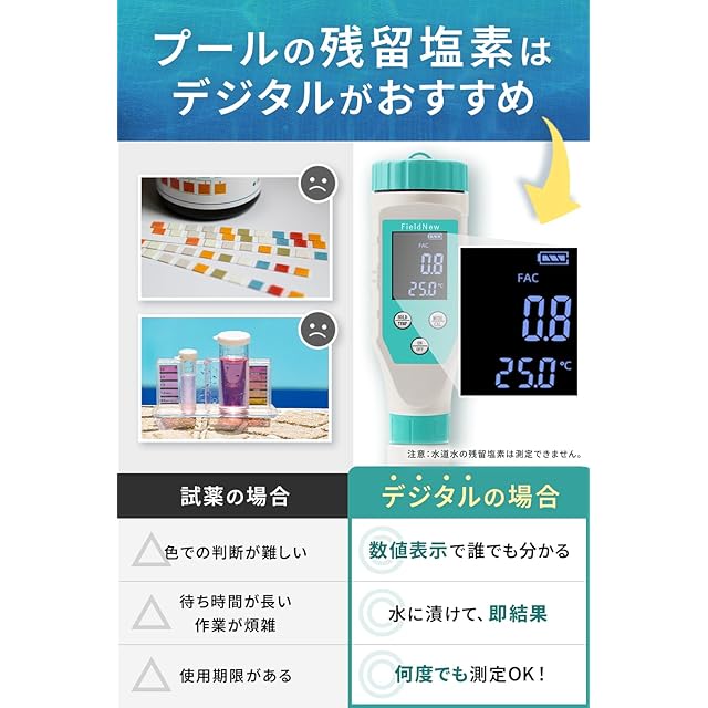 ✅【塩素の安心検査】《注意》プールや消毒液専用です。うすい溶液や水道水の残留塩素は測定できません。遊離残留塩素を測定できるからプールの消毒効果のチェックが水に浸けるだけで簡単にできます。試験紙の場合は紙の色で見分けることが難しく、使用期限があるため使い切りになります。一方、本測定器ではデジタルで値が表示され何度でも測定できます。さらに、使用期限がないため次の夏にも使用することができるためおすすです。