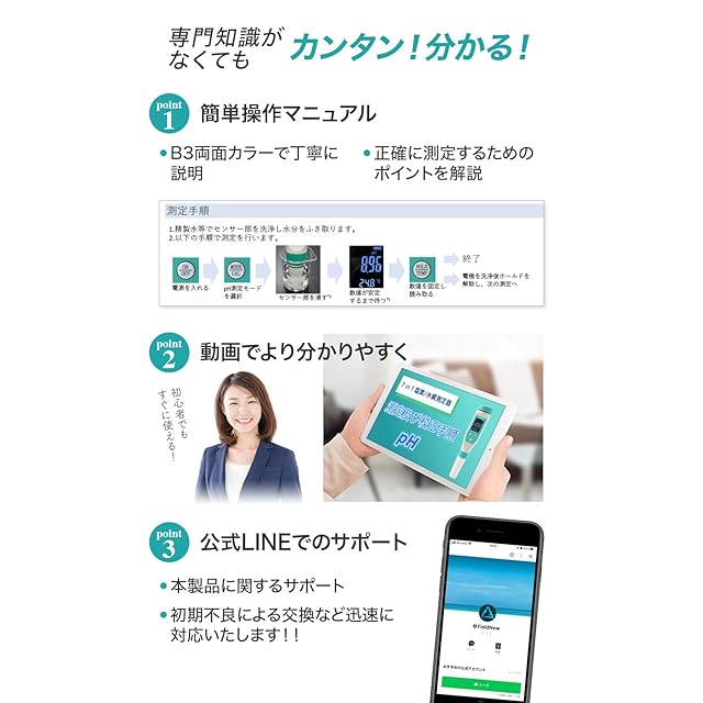 ✅【簡単に操作できる!】測定モードを選択しサンプルに漬けるだけで簡単に測定できます。B3両面カラーの簡単操作マニュアルで、誰でも簡単に操作できます。また、動画でも測定や校正の手順を説明しているので、より分かりやすい。さらに、マニュアル内に「校正頻度の目安」や「各測定項目の説明」を記載しているので測定結果を活用することができます。