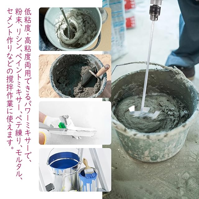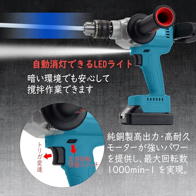 【LEDライト付き&様々な材料の撹拌に】自動消灯できるLEDライトが搭載されており、暗い環境でも安心して撹拌作業できます。低粘度・高粘度両用できるパワーミキサーで、粉末、リシン、ペイントミキサー、ペテ練り、モルタル、セメント作りなどの撹拌作業に使えます。