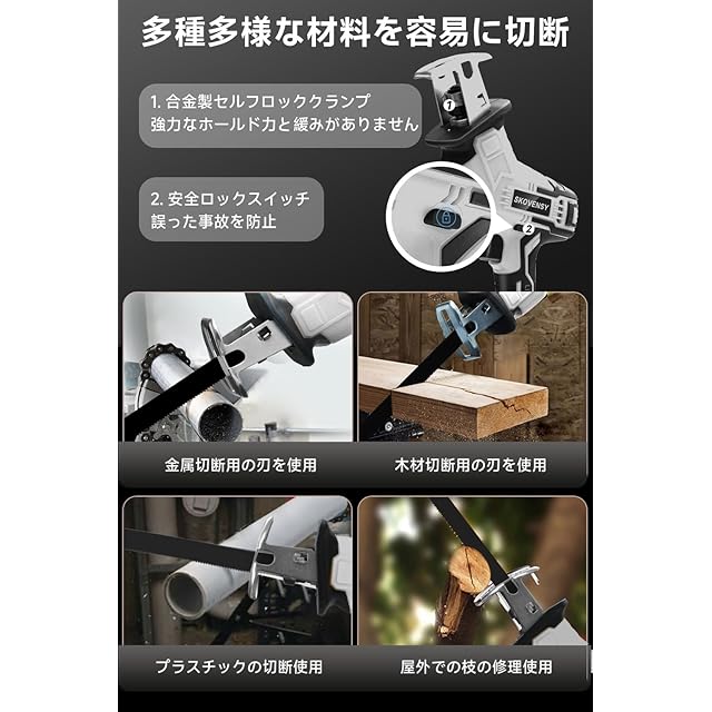 【効率的な切断と安全保護】片手で操作できるこのパワフルなレシプロソーは、高い効率で切断作業を行います。さらに、安全を重視した個別設計の安全ロックボタン機能が搭載されており、安全な操作を確保し、使い勝手を向上させます。