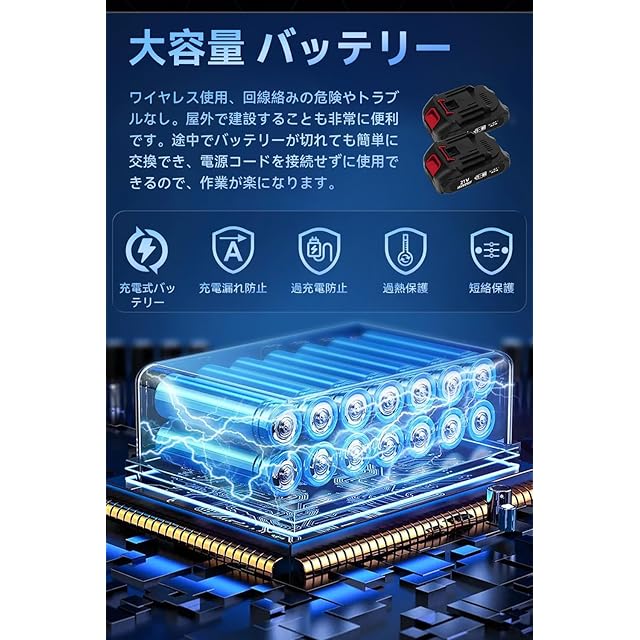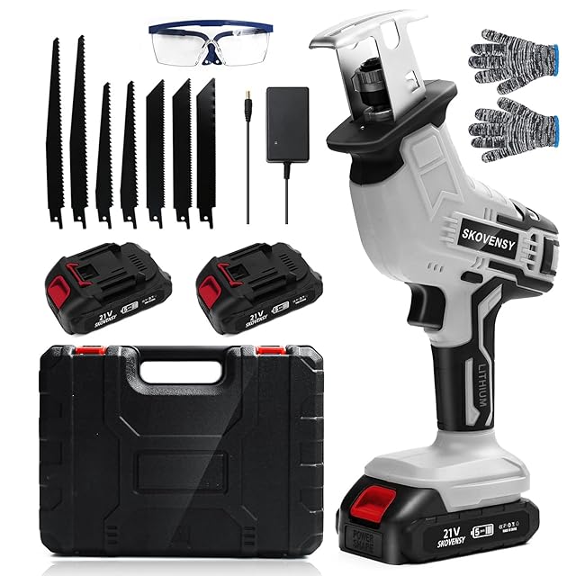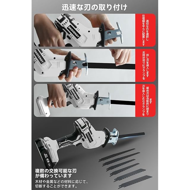 【豊富なアクセサリー】付属品:本製品には、コードレス往復鋸本体、バッテリー2個、急速充電器1個、保護ゴーグル1個、手袋1双、収納ケース1個、日本語の取扱説明書1冊が含まれています。7種類の異なるサイズの鋸刃が装備されており、作業環境に応じて柔軟に交換でき、多用途に使用できる効果があります。