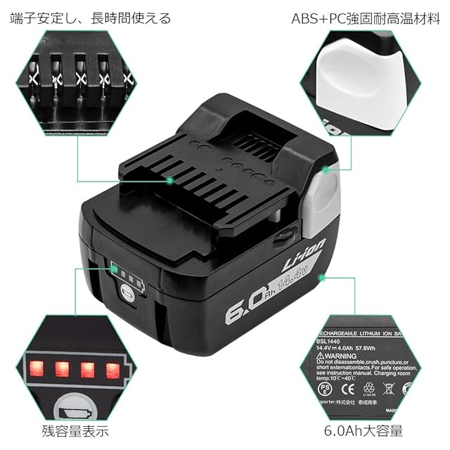 ★【LED残量表示】bsl1460b互換 6.0Ah LED残量表示,残量を素早く確認できるので便利です。メモリ効果がないため、継ぎ足し充電も可能になりました、安心の高品質セル&回路搭載 互換バッテリー、それぞれの容量などは商品ラベル通りの真実な仕様です。充電器 >>UC18YDL , UC18YSL3 , UC18YSL2 , UC18YML等などに対応しております