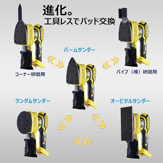 【特徴】工具レスで研磨パッドを交換でき、ランダムサンダーや、パームサンダーに変身できます。そして、狭いコナーを研磨用とパイプやエッジ研磨用の先端パッドもあり、万能な1台5役サンダー。(ご注意:本商品は木工用仕上サンダーと設計されてあり、オービット径が小さいです、モータが同じ回転数でも専用的なランダムサンダーより研削力が弱いことをご理解ください。)